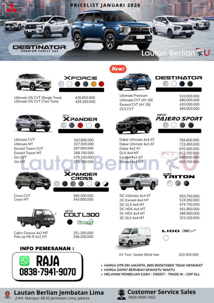 Jangan lewatkan kesempatan emas ini! Miliki mobil Mitsubishi impian Anda sekarang juga dengan penawaran terbaik yang pernah ada. Hubungi kami segera dan mulailah perjalanan baru bersama Mitsubishi โ Partner Setia Perjalanan Anda.